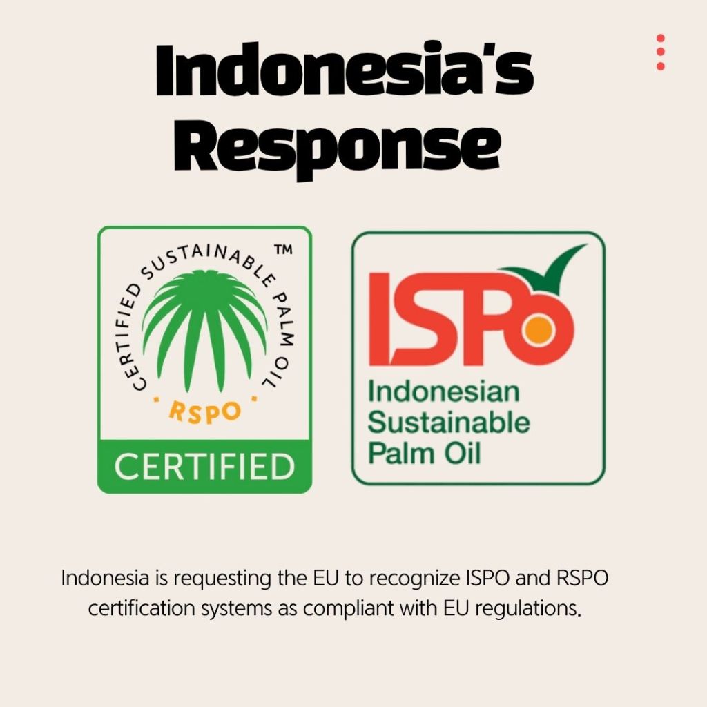 To minimize the impact of the EU regulations on its palm oil industry, the Indonesian government is exploring several response strategies. One of the key strategies is the adoption of certification schemes such as the RSPO (Roundtable on Sustainable Palm Oil). The Indonesian government hopes to have these certification schemes recognized as compliant with the EU’s environmental regulations.